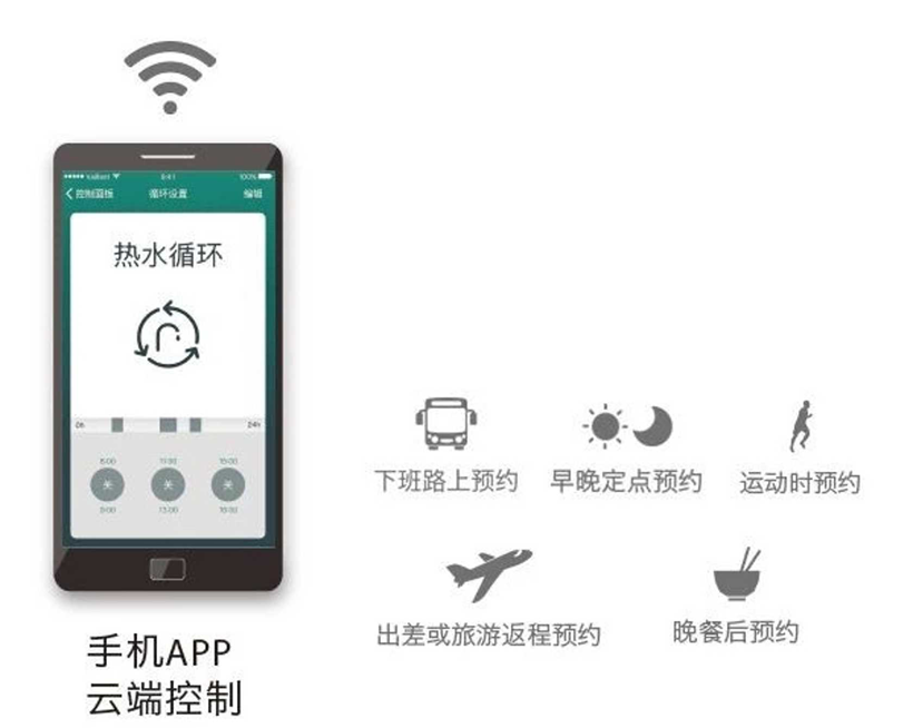 除此之外,還可以下載手機APP進行云端控制,用戶可以在APP上個性化定制熱水習(xí)慣,下班路上或者出差旅行途中也可以隨時預(yù)約。通過手機端APP用戶還可以一鍵開啟熱循環(huán)模式,達到設(shè)定溫度后APP會提醒用戶,更智能便捷。